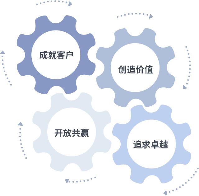 成就客户是一切决策的出发点,,,,创造价值是衡量所有工作的标准,,,,追求卓越是我们做事做人的态度,,,开放共赢是我们的格局也是最终的结果。。。价值观的齿轮环环相扣,,,推动着组织里的每个人不断向前。。。