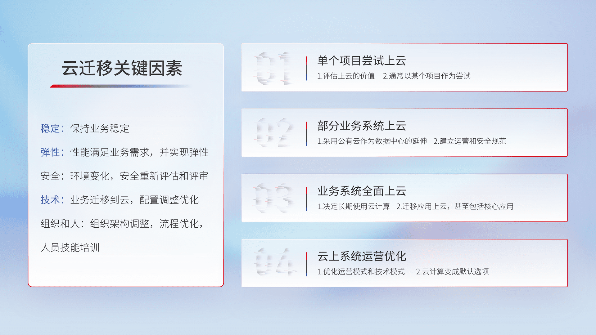 结合实际业务,,,从规划设计、、、云平台选型、、云原生改造、、、、数据迁移、、集成交付,,,迁移全过程为客户识别最佳上云路径,,,,做好风险识别管理,,,,设计网络架构、、、、身份权限、、、安全审计合规、、操作审计、、日志审计、、、监控告警策略、、、、多站点容灾设计等,,,,对云上基础设施进行整体规划,,,,提升IT治理水平,,,,以满足弹性、、、、高可用、、高性能的需求。。